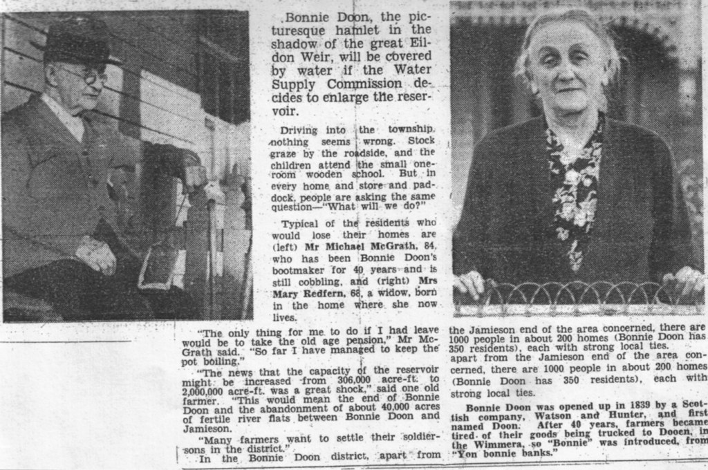 Residents were forced to create a new home for themselves in a ‘new’ Bonnie Doon, located about 500m west of the original town site. Of course, there were residents who preferred to move away altogether, while others could not envisage living anywhere else but in Bonnie Doon.
